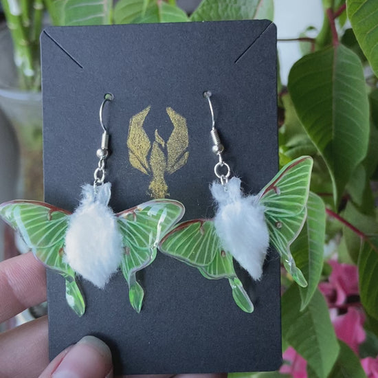 Fuzzy Luna Moth Shrinky Dink Earrings, Made to Order!!! These earrings are quintessential cottage core and perfect for any casual fairy! I made them a little bit larger than normal so I could show off their adorable FUZZY bodies! Because of the shrink plastic material, these earrings also have a stained glass look to them. Fun Fact: Luna moths are one of the largest moth species that are found in North America.